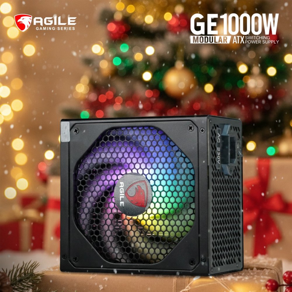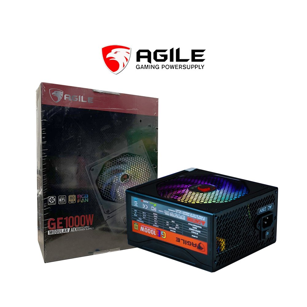 The Agile GE1000 Gold Modular RGB appears to be a 1000-watt, 80 Plus Gold certified, fully modular power supply unit (PSU) with an RGB fan, likely produced by the brand Agile (powered by Powerlogic) primarily for the Philippine market.