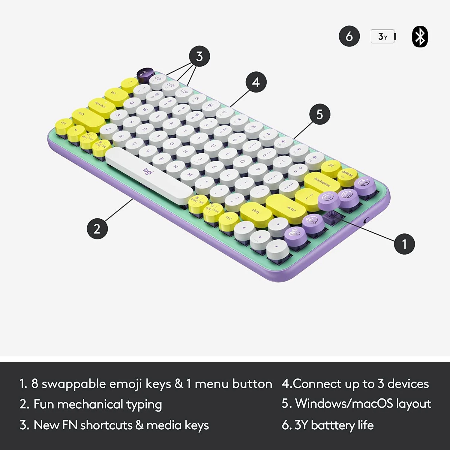 The Logitech POP Keys Wireless Mechanical Keyboard (Daydream Mint) features a “summer chilling” aesthetic with a blend of mint, lilac, white, and sunshine yellow. It is designed for multi-device productivity and self-expression, featuring tactile mechanical switches and customizable emoji keys.