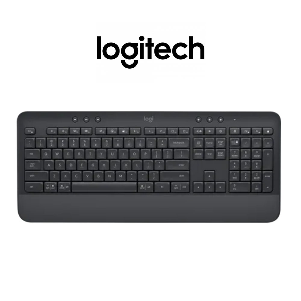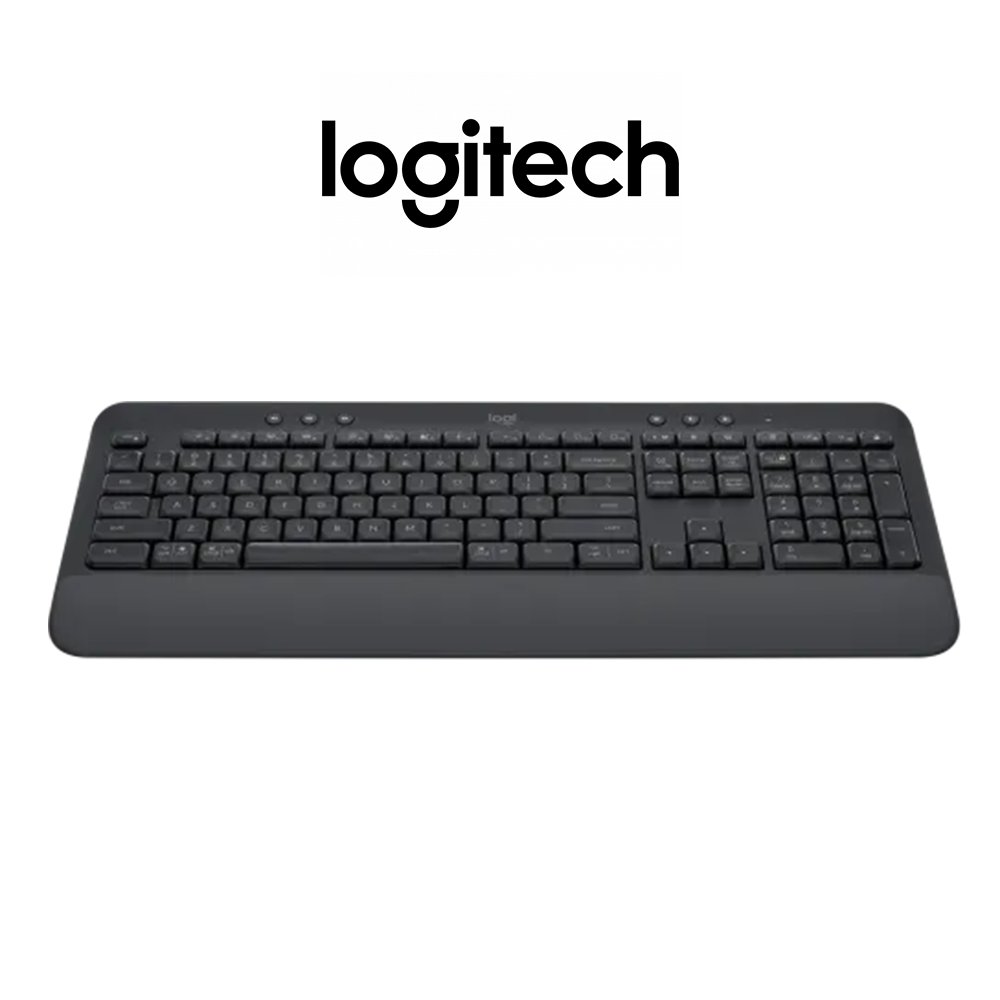 The Logitech Signature K650 Wireless Keyboard is a full-size office keyboard designed for long-term comfort, featuring an integrated soft-touch palm rest and deep-cushioned keys. It prioritizes sustainability, with up to 28% recycled plastic used in its construction.