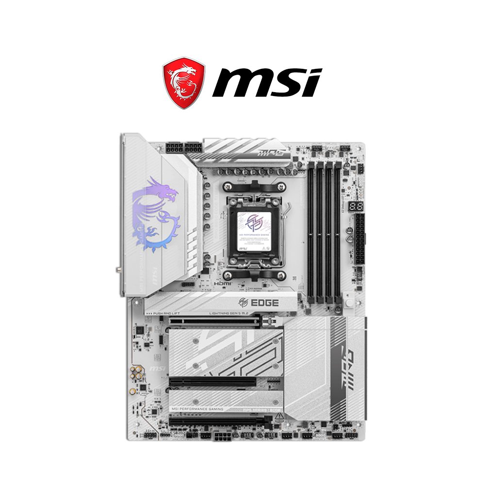 The MSI MPG B850 EDGE TI WIFI is an ATX motherboard designed for gaming and high-performance PC builds with AMD Ryzen 7000, 8000, and 9000 Series processors. It features a distinctive silver-white color scheme, advanced connectivity like Wi-Fi 7 and 5G LAN, and support for PCIe 5.0 and DDR5 memory.