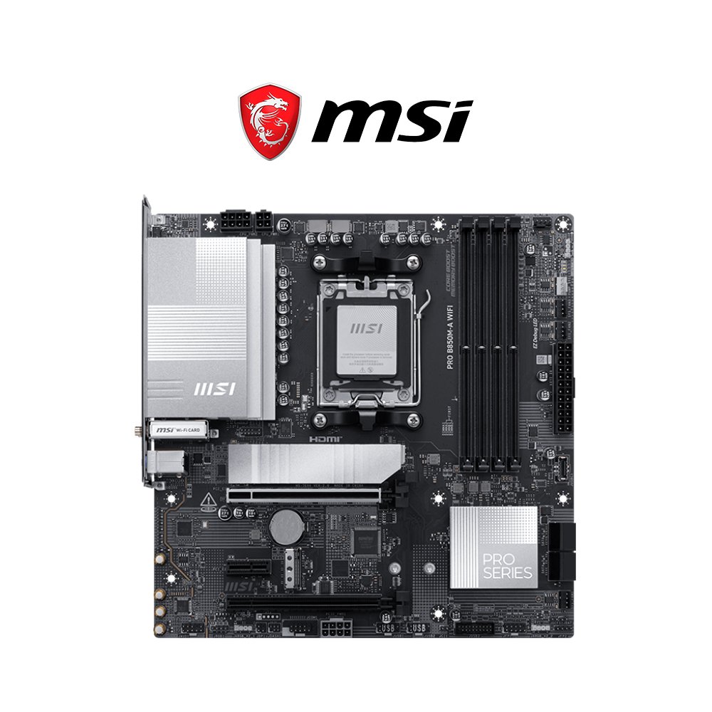 The MSI PRO B850M-A WIFI is a micro-ATX motherboard designed for AMD Ryzen 7000, 8000, and 9000 Series processors, featuring a robust power delivery system, DDR5 memory support, and high-speed Wi-Fi 7 and 5G LAN connectivity.