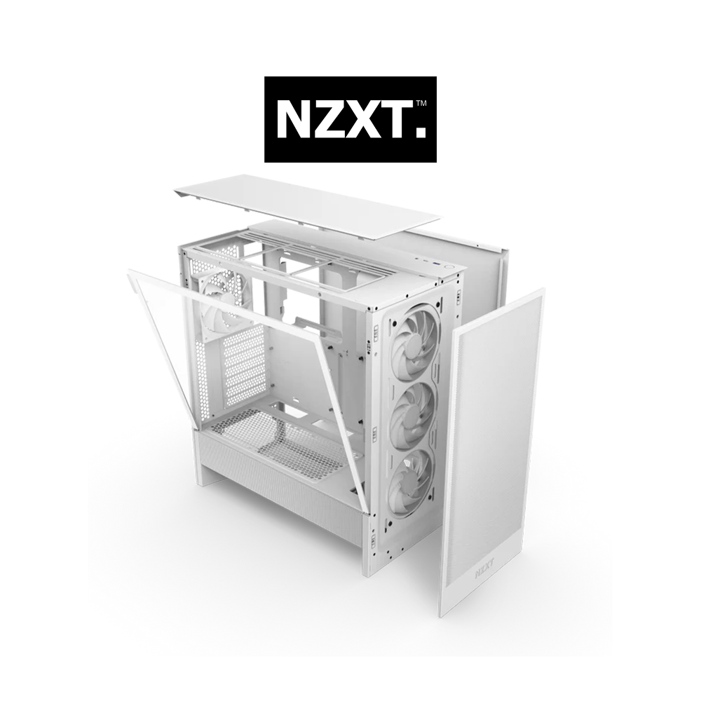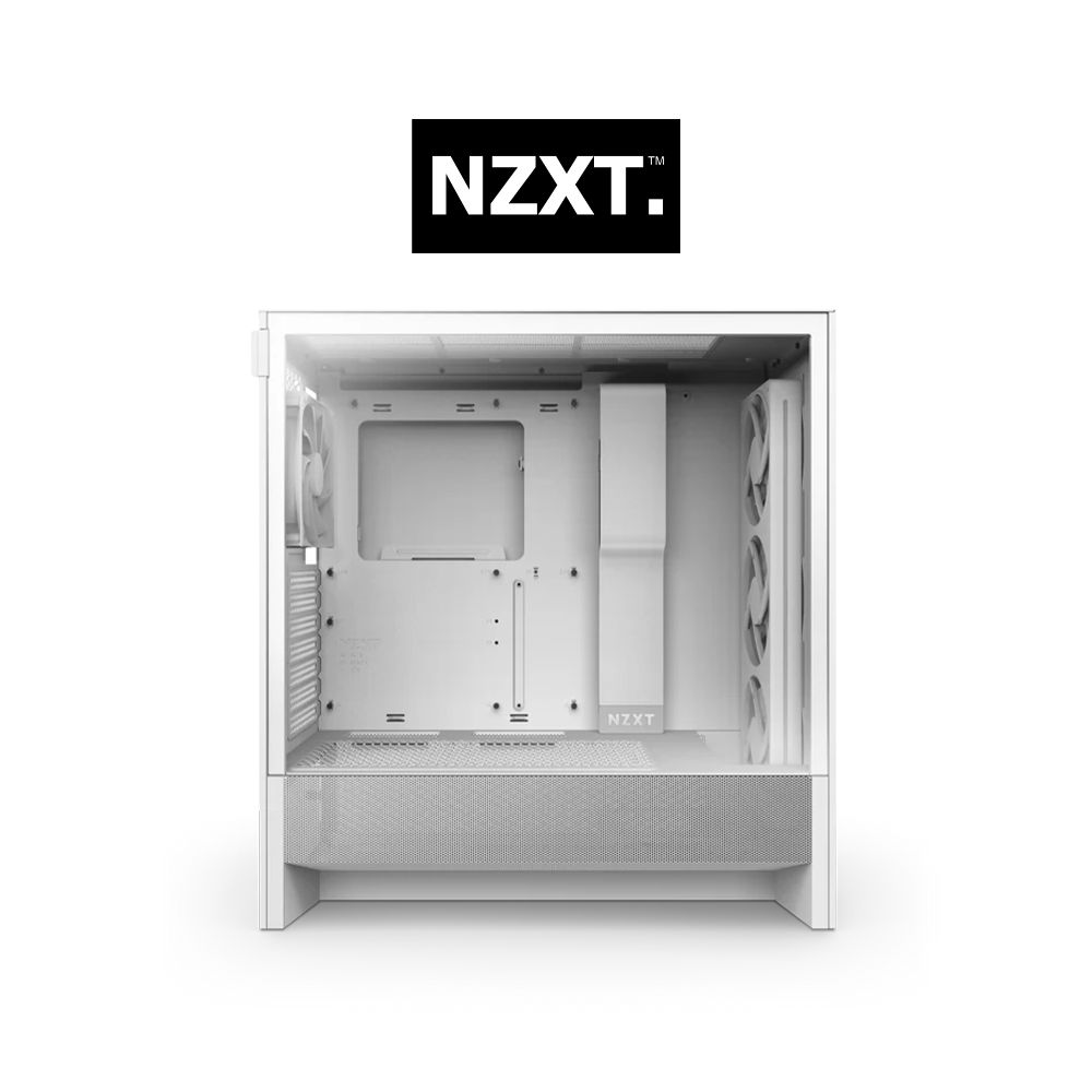 The NZXT H5 Flow RGB is a compact ATX mid-tower case engineered for maximum airflow and brilliant aesthetics. It features a dedicated fan on the bottom inner panel that is angled to cool the GPU directly, along with pre-installed F120 RGB Core fans for effective cooling and vibrant lighting. With its perforated top, front, and side panels, plus ample clearance for large components, this case provides excellent thermal performance and easy buildability.
