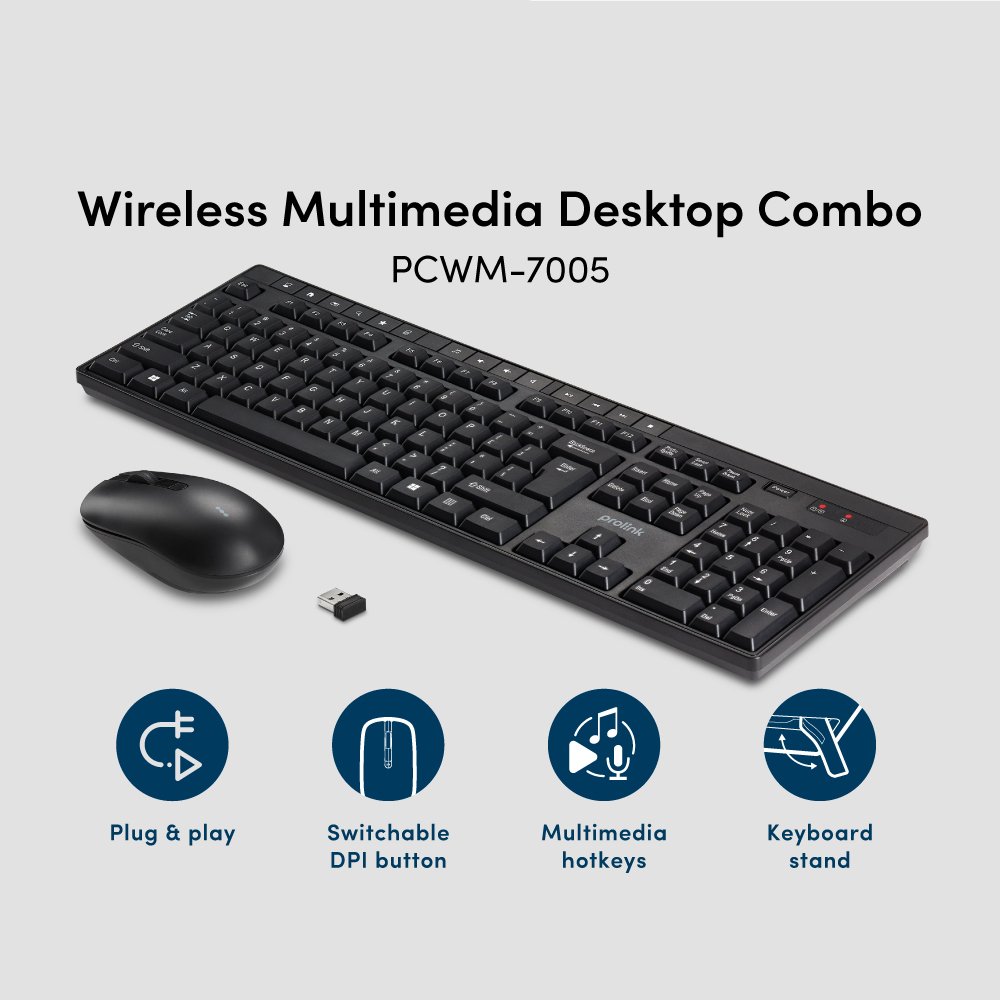 The PROLiNK PCWM-7005 is a 2.4GHz wireless multimedia desktop combo consisting of a 104-key keyboard and an optical mouse that share a single Nano USB receiver. This “plug-and-play” set is designed for everyday office and home use, featuring dedicated multimedia hotkeys and an ambidextrous mouse.