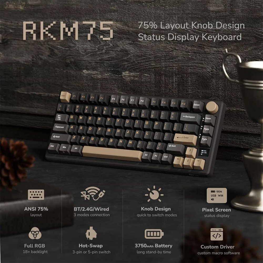 The Royal Kludge M75 is a popular 75% layout wireless mechanical keyboard known for its gasket-mounted design, tri-mode connectivity, and an OLED smart display with a multi-function knob. It offers a high-quality build and smooth typing experience at a competitive price point.