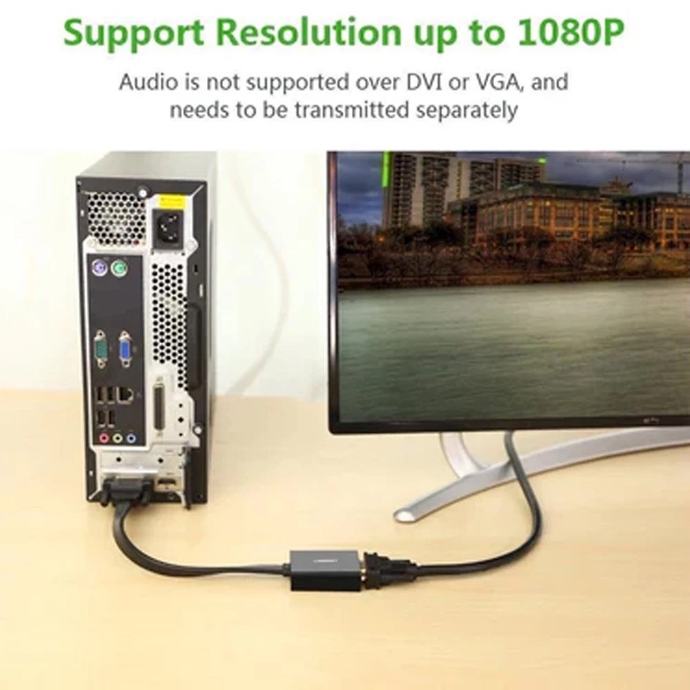 NOTE: Display screen must support a compatible resolution and refresh rate as the source. Plz power our device trough the micro USB port on it using a 5V/2A (Max) power adapter (NOT included) if you connect the adapter to the power hungry devices. Due to the limitation of VGA standard, audio transmission is not available for the adapter. ( 3.5 mm Audio cable is sold separately. 1080p DVI-D to VGA Adapter An ideal option to connect a video graphics card or PC with DVI-D(24+1) or DVI-I(24+5) interface to a projector or monitor with VGA input. With this adapter, you can enjoy HD video or other content on your big VGA display.